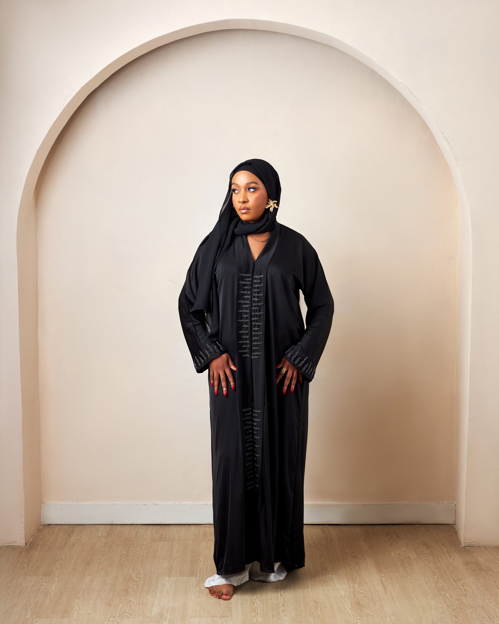 Where sophistication meets subtle luxury — the Emerald Noir Abaya is crafted in deep black and adorned with dark green stones that glimmer softly like hidden jewels. The rich green detailing adds a touch of elegance without overpowering, making it perfect for the woman who values understated refinement.