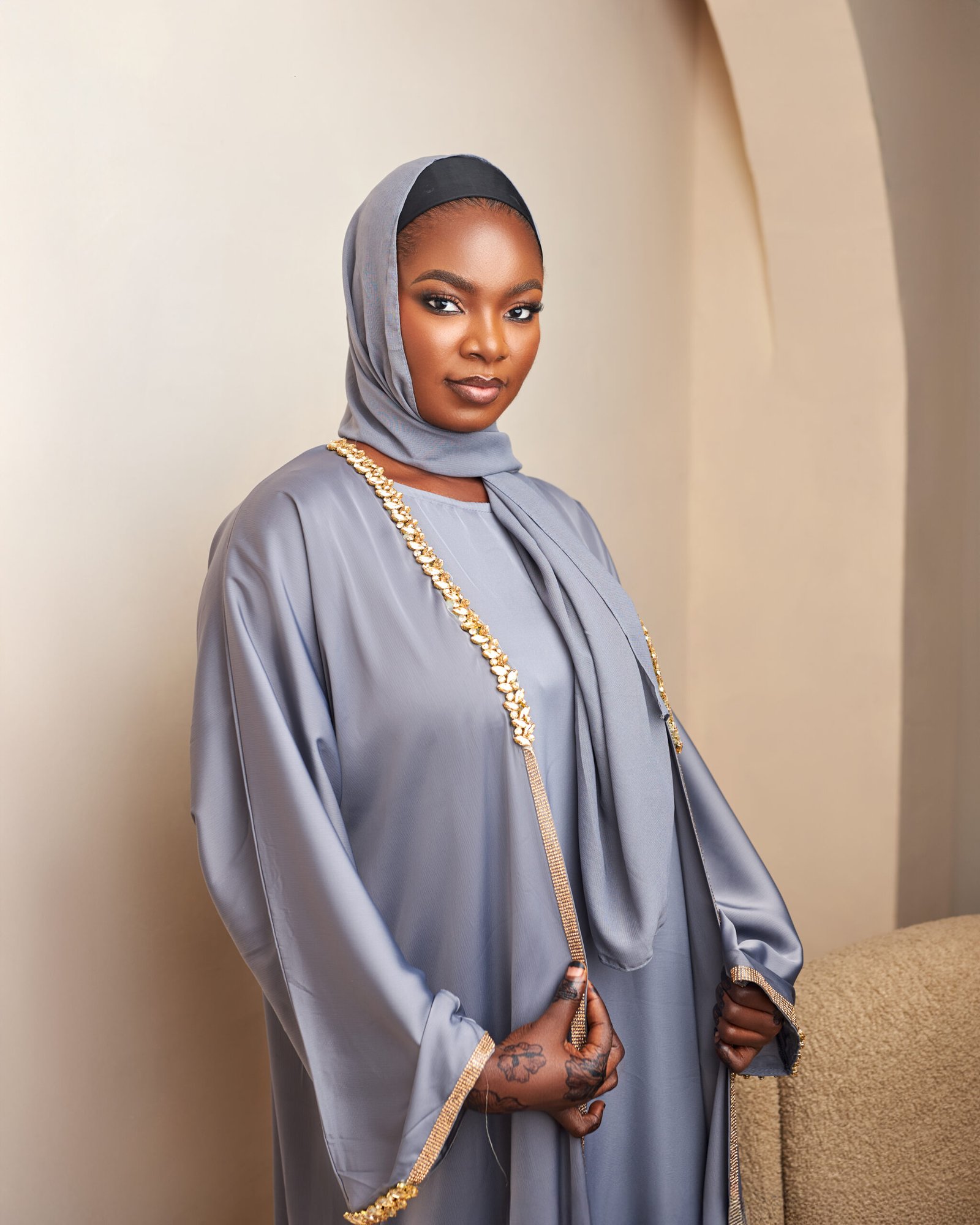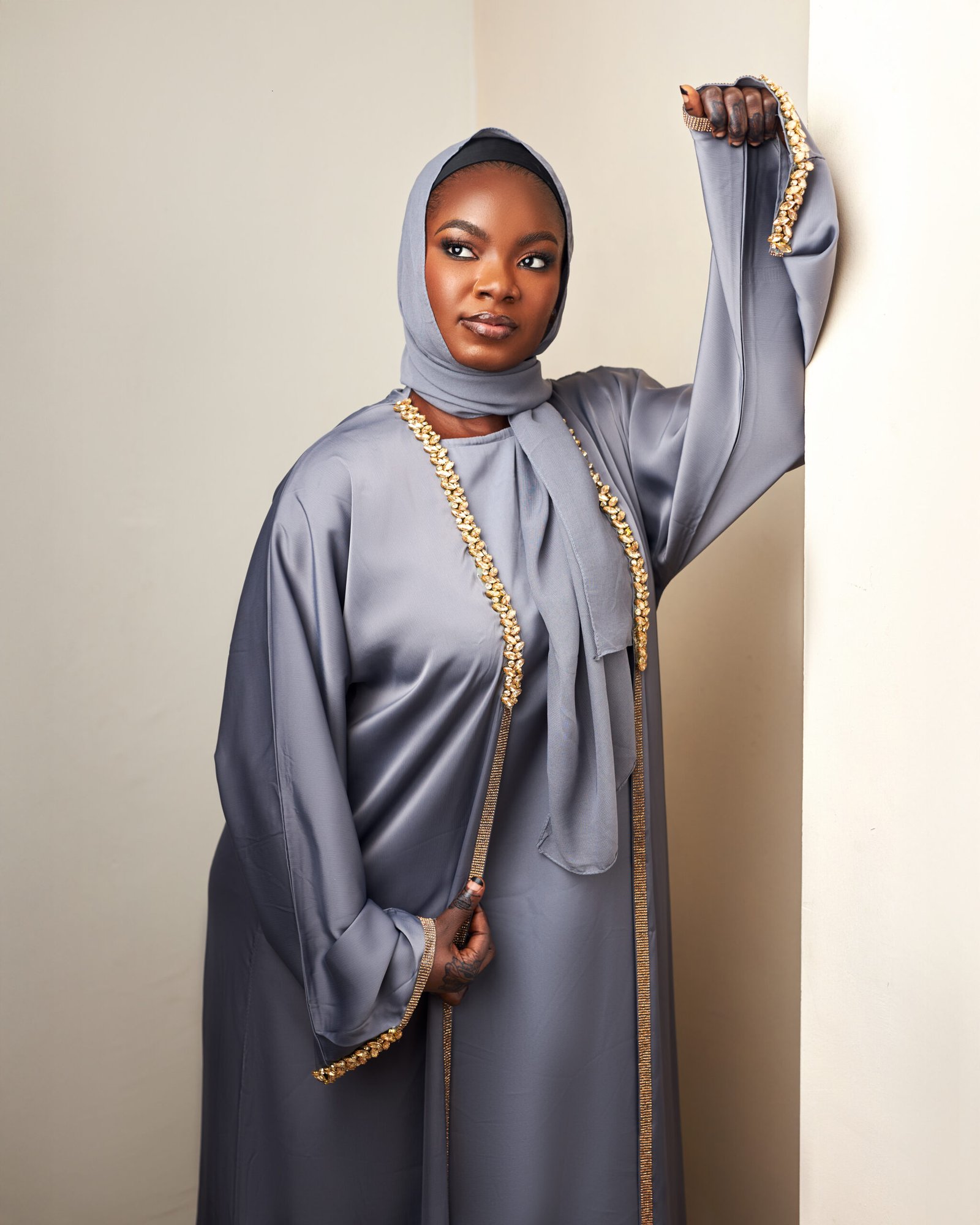 A regal blend of grace and luxury, the Golden Twilight Abaya features a soft bluish-grey fabric beautifully finished with golden stone embellishments along the edges. The delicate shimmer of gold against the muted tone creates a refined contrast, making this piece both subtle and striking.