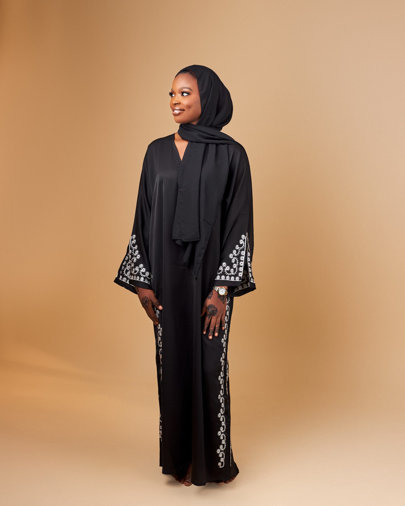 • Black abaya with delicate white embroidered detailing