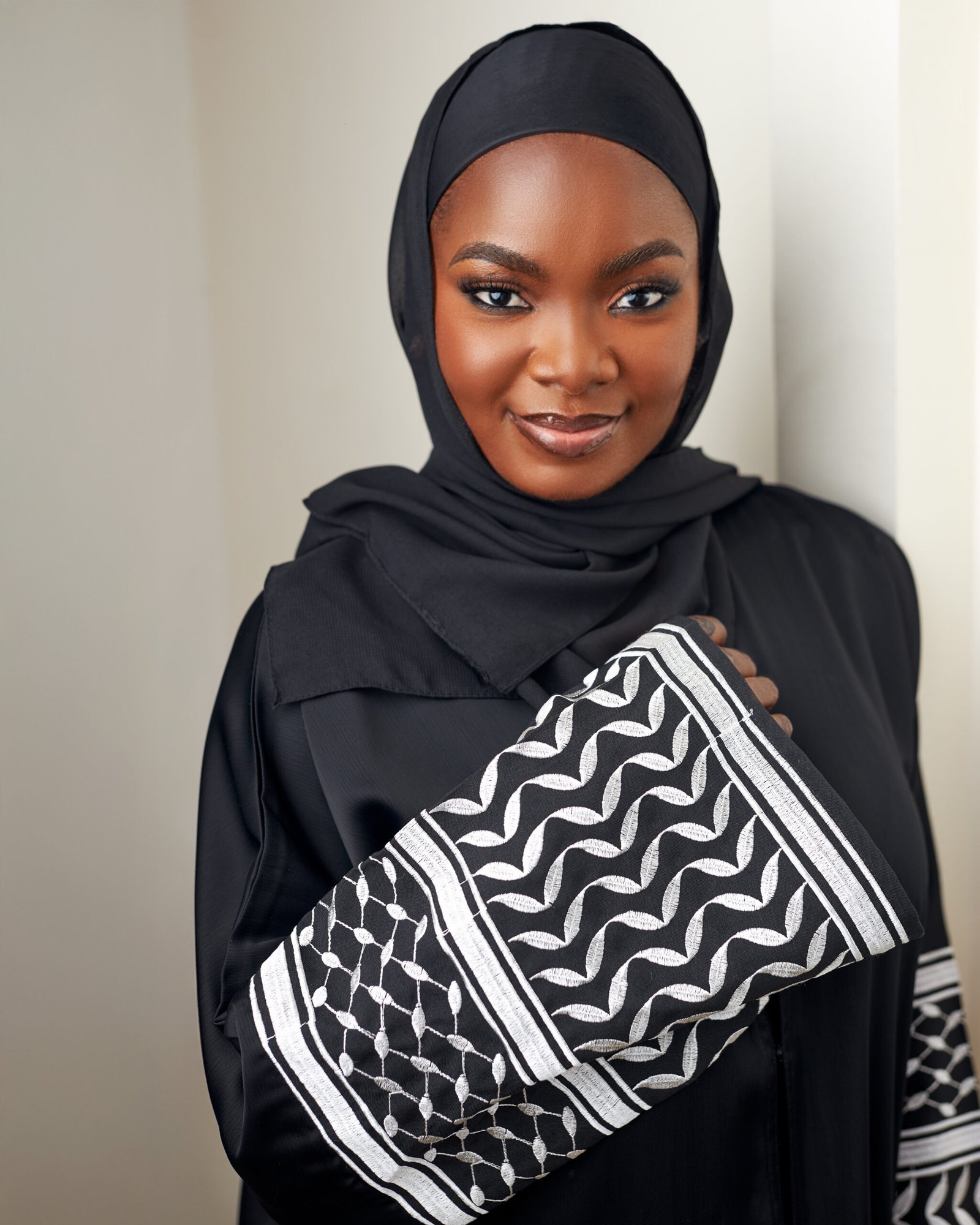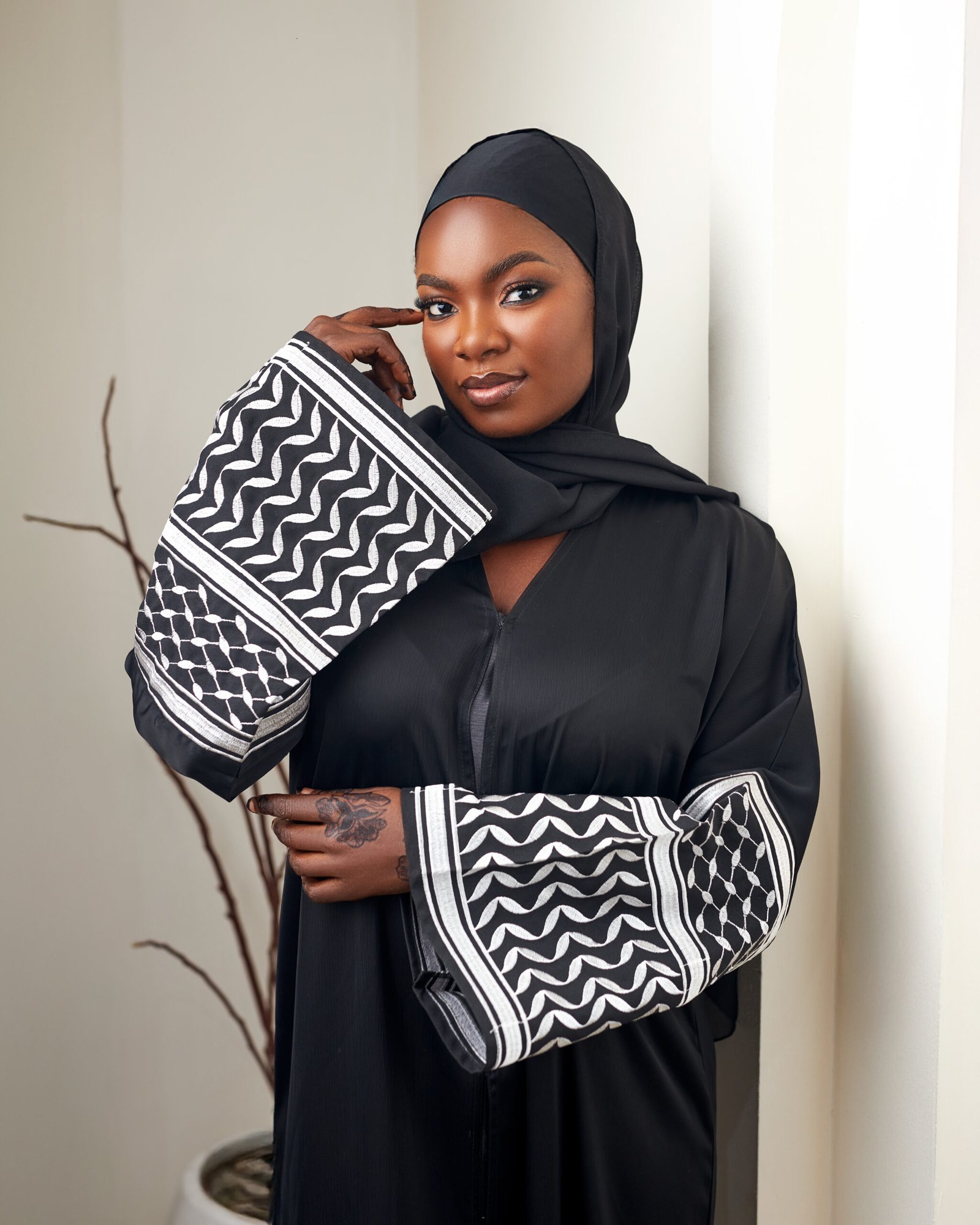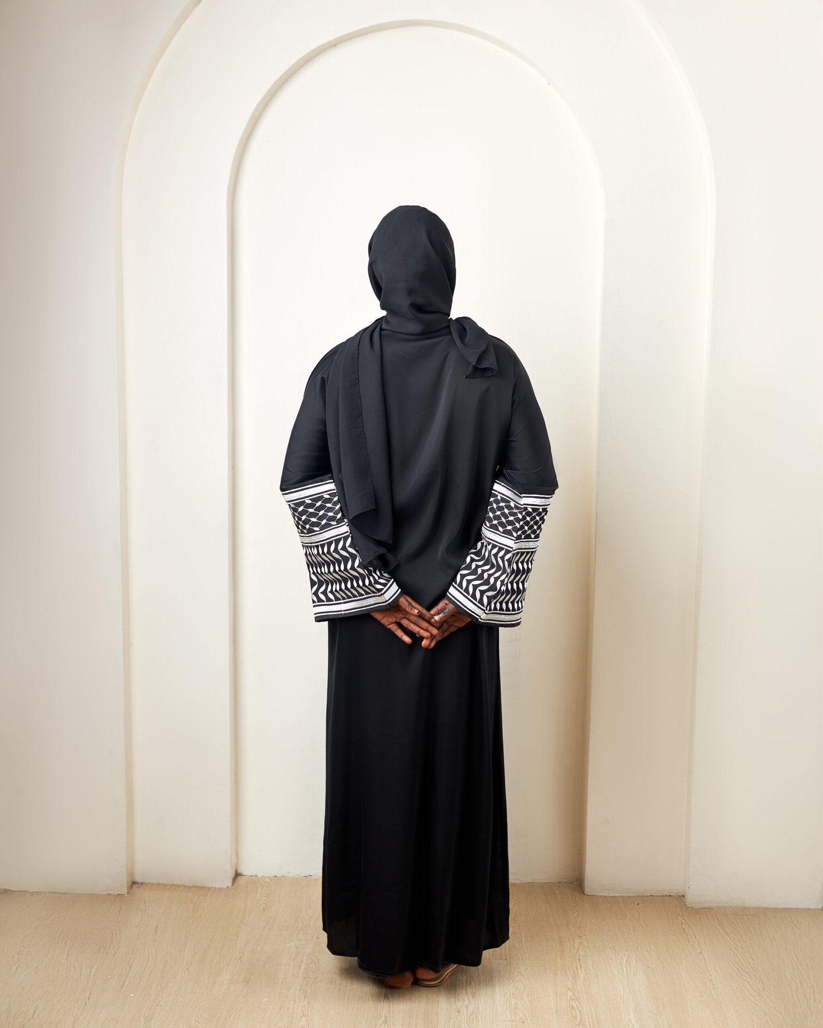 • Black abaya with striking black and white embroidered detailing